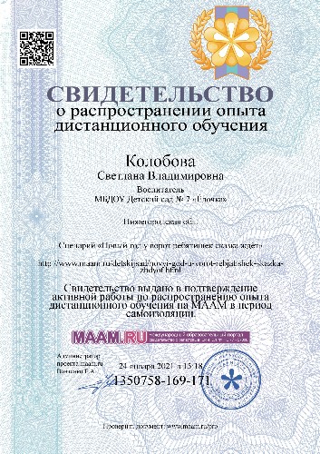 Свидетельство о распространении опыта дистанционного обучения на образовательном портале 2021 год