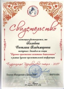 Свидетельство об участие в Епархиальных Варнавинских чтениях -2019" с докладом на тему "Духовно-нравственное воспитание дошкольников"