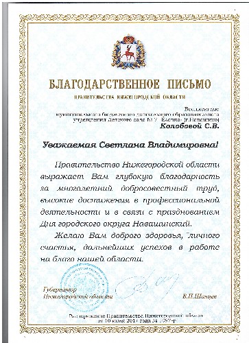 Благодаственное письмо главы местного самоуправления и главы Администрации городского округа Навашинский
