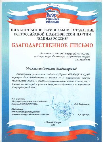 Благодарственное письмо от Нижегородского регионального отделения Всероссийской политической партии "Единая Россия"