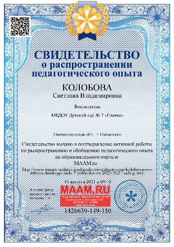 Свидетельство о распространении педагогического опыта на образовательном портале 2020 год
