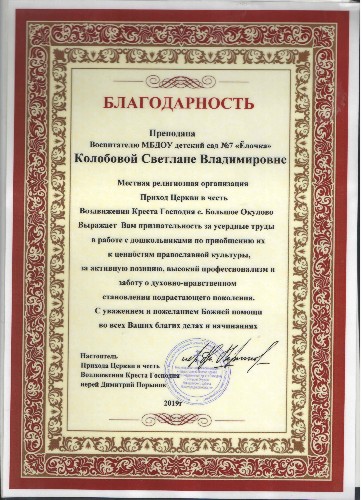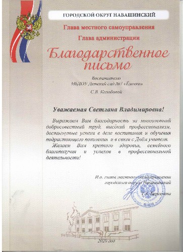 Благодаственное письмо главы местного самоуправления и главы Администрации городского округа Навашинский